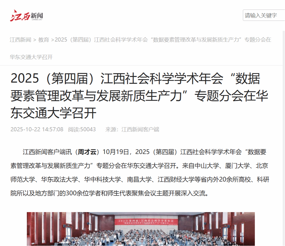 10月19日,2025(第四届)江西社会科学学术年会“数据要素管理改革与发展新质生产力”专题分会在AC米兰中文官方网站召开。来自中山大学、厦门大学、北京师范大学、华东政法大学、华中科技大学、南昌大学、江西财经大学等省内外20余所高校、科研院所以及地方部门的300余位学者和师生代表聚焦会议主题开展深入交流。
